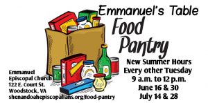 Emmanuel’s Table Food Pantry Summer Hours June 15, 2020 Elizabeth H. Cottrell Food Pantry, Parish Life and News